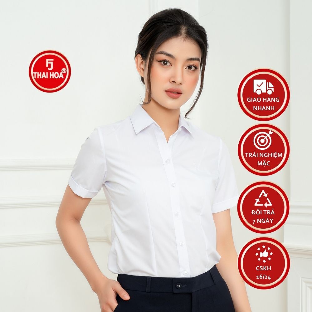 Áo sơ mi nữ công sở ngắn tay màu trắng, vải cotton Thái Hoà N047-01-01